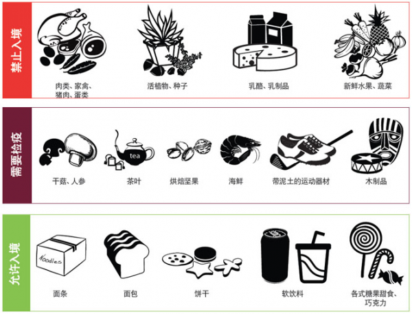 下列物品严禁带入:乳制品、蛋及蛋制品(如月饼、但儿童偕行可携带配方奶粉)、非罐装的肉类制品(如腊肉、香肠、肉松及宠物食物等)、活的动物(哺乳动物、飞禽、昆虫等)、活的植物(如盆景等)、含有被保护动物成份的传统药物(如鹿茸制品等)、各类种子、新鲜或冷冻的各类水果、蔬菜。