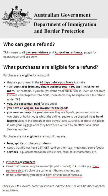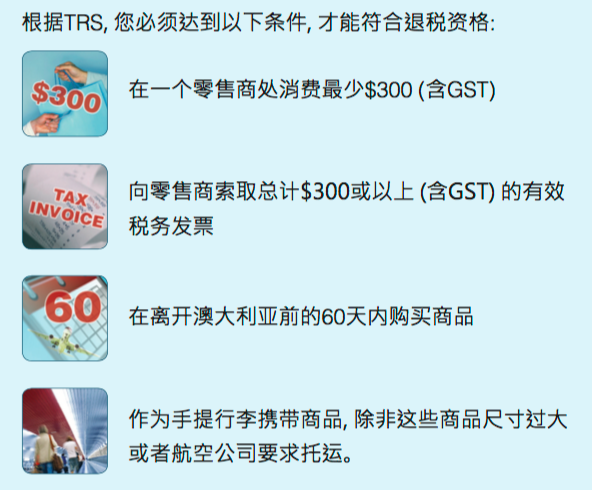 根据游客退税计划 (Tourist Refund Scheme, 简称TRS) ,澳大利亚和海外游客可以对在澳大利亚购买并且作为随身行李携带到海外的商品申请退回商品和服务税 (Goods and Services Tax, 简称GST) 和葡萄酒税 (Wine Equalisation Tax, 简称WET)。
