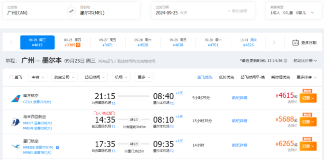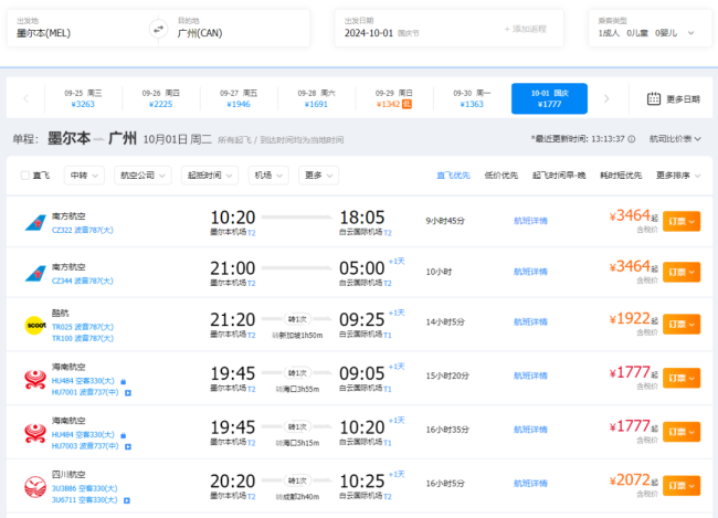 10月6日,广州直飞墨尔本机票3605元,等到国庆假期过去,广州直飞墨尔本的机票只需要2605元。