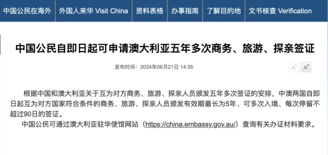 中国不仅给澳洲开通了免签入境通道,两国还特意官宣,开放5年多次往返商务、旅行、探亲签证。