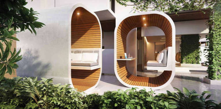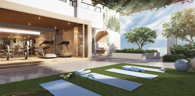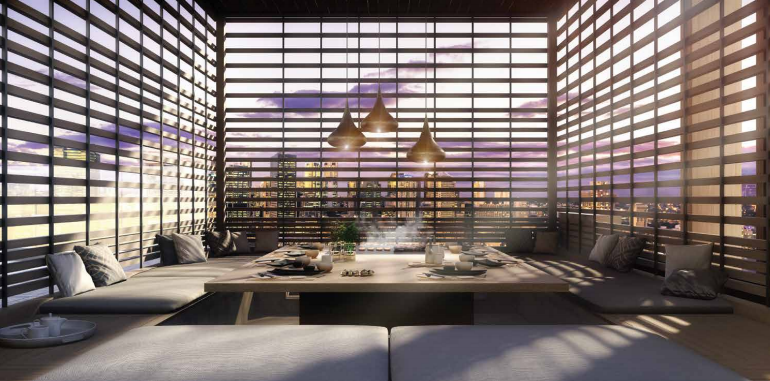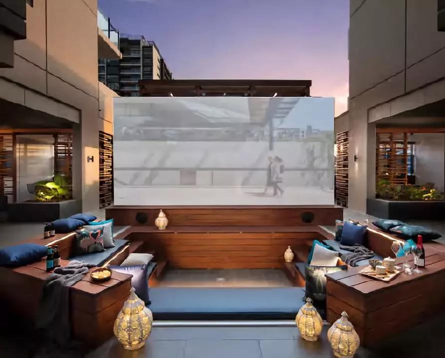第5层为业主私享空间:拥有度假式休闲娱乐配套设施,包括烧烤区、户外影院、餐饮吧台、健身房、瑜伽室、泳池、Spa等等