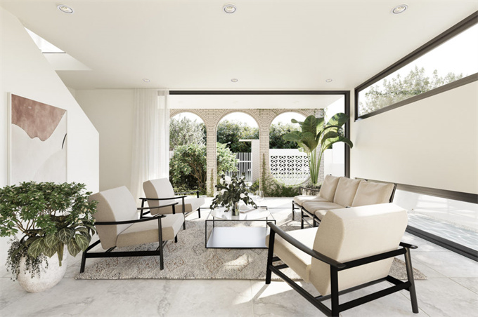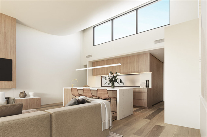 > 3.2 米高的客厅天花板,带有高高的朝北窗户,用于被动冷却
