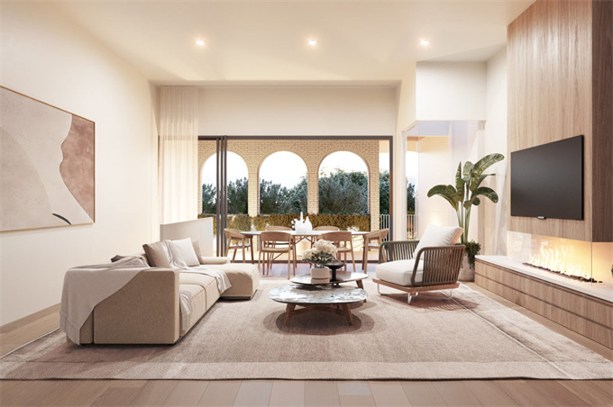 精致的开放式居住空间无缝连接到私人露台,创造出一个充满光线的延伸区域,与您的客厅和餐厅区融为一体,优雅地被令人惊叹的拱形外立面框住。柔和的色调与自然石材、木地板和精美的橱柜相得益彰,完美地与树木和天空的迷人背景形成对比。
