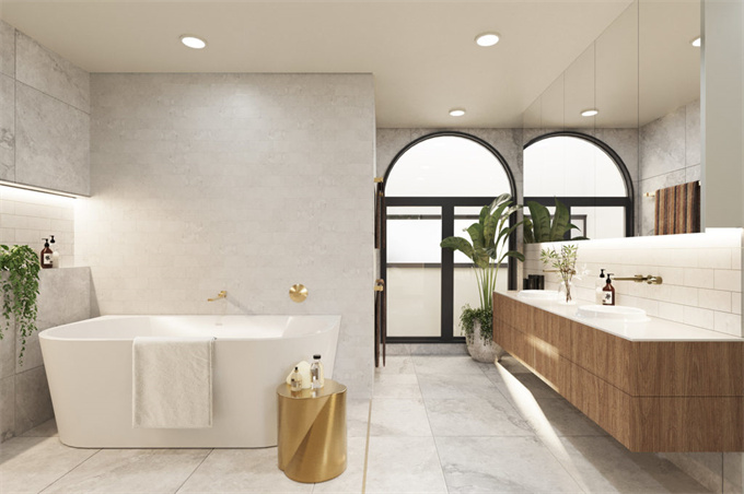 一个精致的浴室配有美丽的落地瓷砖、悬浮式双洗手台,搭配Corian台面、清新的雨淋式淋浴和深邃的独立浴缸。这是远离世界的避风港,让人沉浸在舒缓宁静的氛围中。