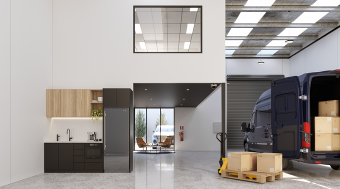 • 带有超大窗户的铰接式立面,可让光线充足的仓库。