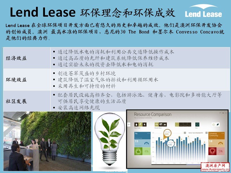 Lend Lease 在全球环保项目开发方面已有悠久的历史和卓越的成效。他们是澳洲环保开发协会的创始成员。澳洲 最高水准的环保项目,悉尼的30 The Bond 和墨尔本 Convesso Concavo就是他们的经典力作。