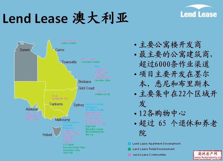 Lend Lease是澳大利亚主要公寓楼开发商,最主要的公寓建筑商,超过6000条作业渠道,项目主要开发在墨尔本,悉尼和布里斯本主要集中在22个区域开发,12各购物中心,超过 65 个退休和养老院。