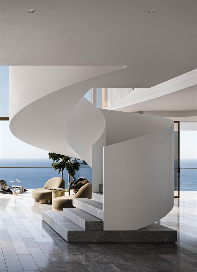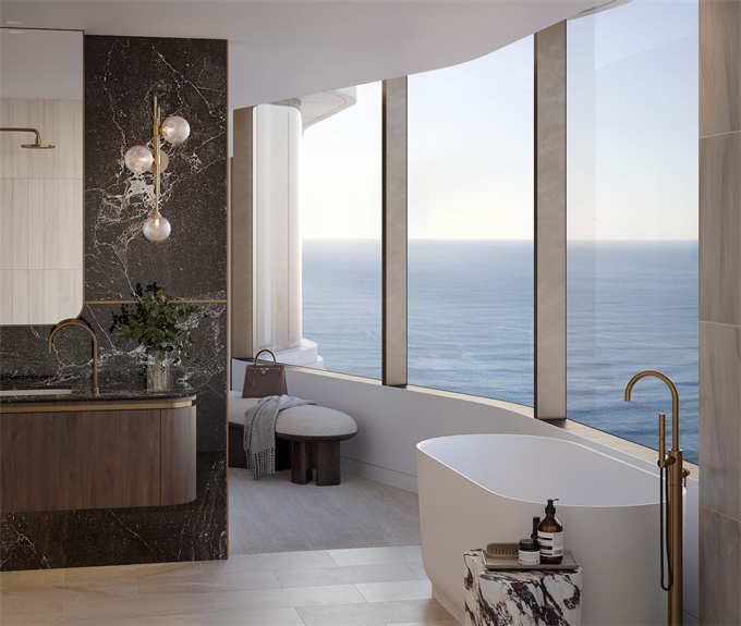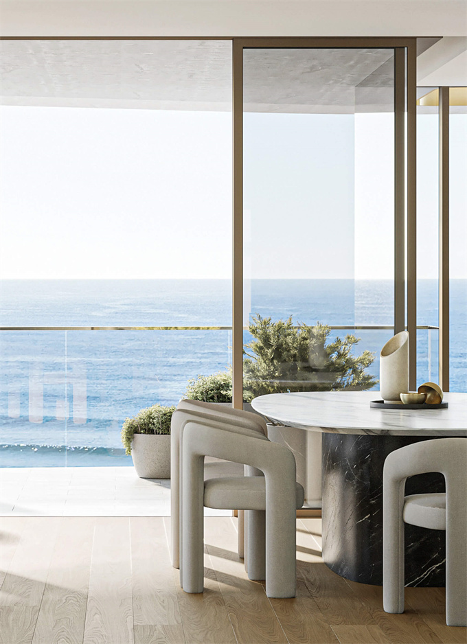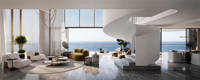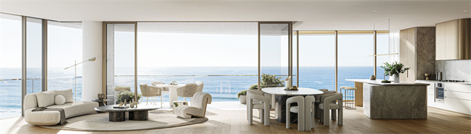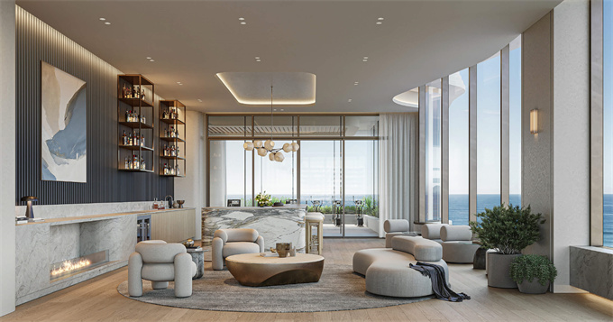 Aalto 的室内设计与建筑的雕塑设计美学相呼应,重新定义了奢华生活——以壮观的海洋和天空为背景。精致的室内配色由受沿海环境启发的自然装饰以及由顶级工匠制作的高端装置组成,为设计师的精致和现代艺术树立了新的标杆。这些空间以宽阔的比例、高耸的窗户和宽敞的室内外流动为特色,无限的空间丰富了日常生活,提供了无尽的娱乐机会。整个过程中,一系列定制作品营造出精致的生活体验,同时体现了对工艺的坚定承诺。