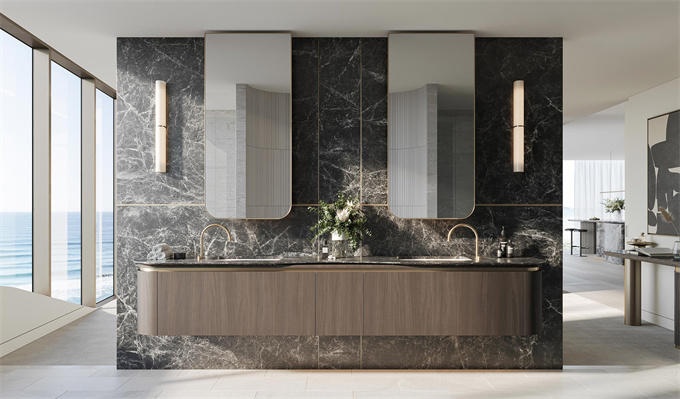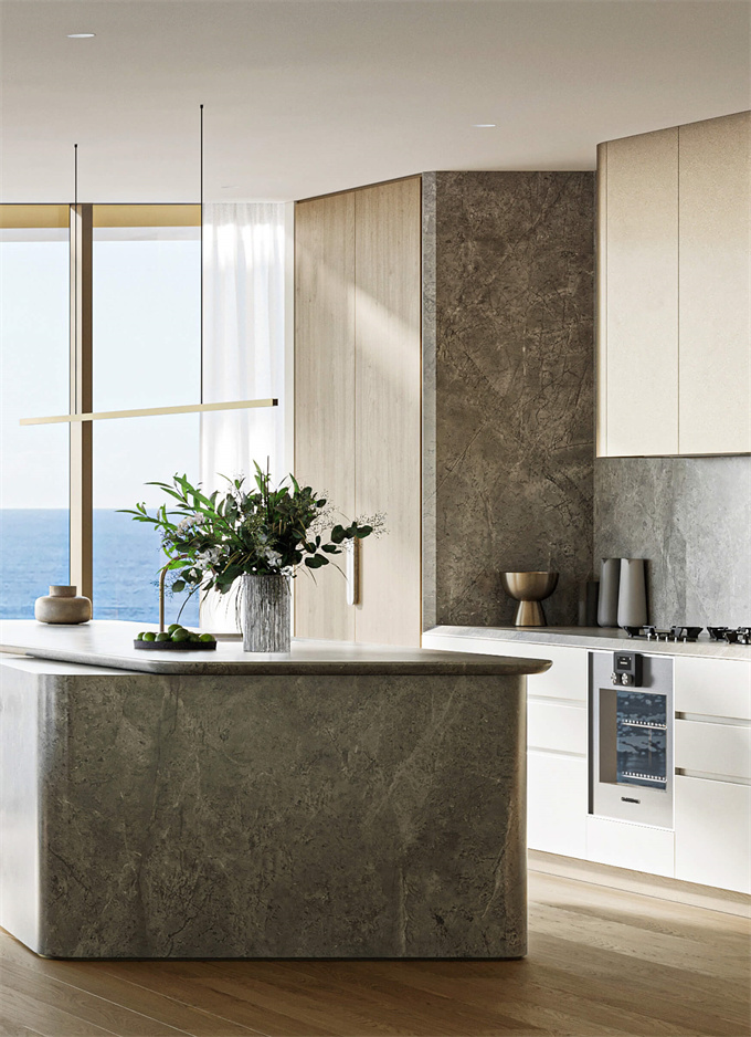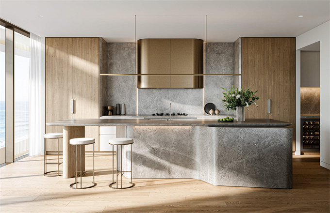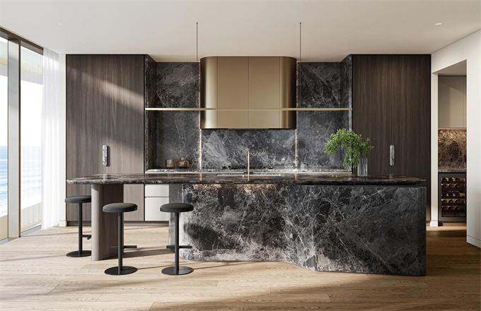 Aalto 的厨房超越了典型公寓设计的参数,呈现出无与伦比的功能性和尖端精致感。岛式长凳由天然石材雕刻而成,是引人注目的中心装饰,也是居民聚会的轻松场所。其弯曲的形状参考了建筑语言,同时为空间带来了柔软和流畅。华丽的青铜细节、高端电器和时尚的特色水龙头点缀其间,这种经过深思熟虑的设计不遗余力。设备齐全的餐具室配有内置葡萄酒冰箱,完美满足娱乐者的生活方式。