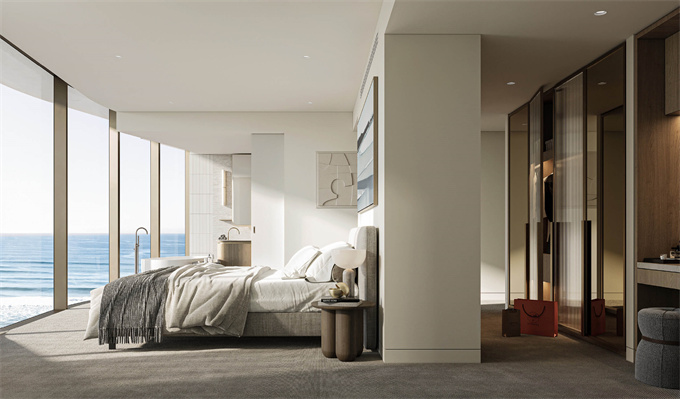 Aalto 的主卧套房体现了罕见的奢华标准。宽敞的卧室可直接俯瞰大海,让住户醒来后就能欣赏到海浪翻滚的美景。这里精心设计的步入式衣橱提供酒店式居住体验,配有充足的储物空间、镜面长袍和定制梳妆台。
