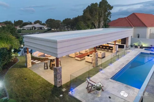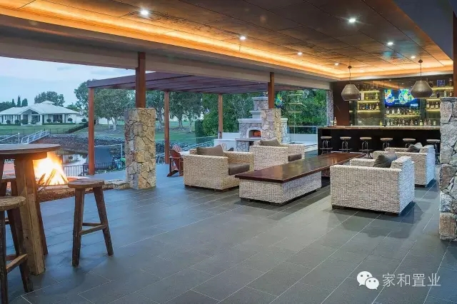 在别墅外部休闲区域,不仅配有超大游泳池、桑拿室、烧烤区域、篝火,还配有酒吧、浴室、卫生间等设施,带给主人最完善、舒适的生活方式;