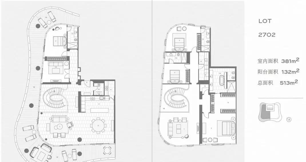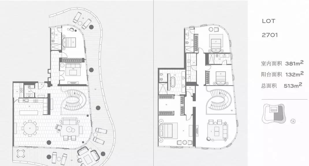 这两套空中双层别墅位于公寓楼的27层和28层,拥有极致的海景。每套别墅总面积达513平方米,包括4个卧室、4套卫浴(每个卧室都配备),还包括书房、多功能室、储物空间等,能满足您一切正式或非正式的生活所需场合。另外,每套别墅还配备3个地下车位和1个储藏室。