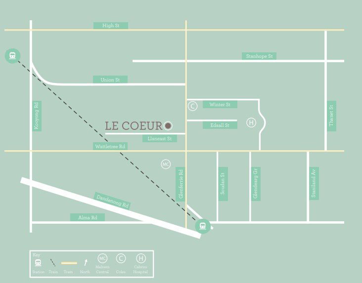Le COEUR独占一个卓越的的位址,临近MONASH大学Caulfield校区,在Armadale国际化的环境中呈现出精致的建筑设计。一个居高临下的入口预示着设计卓越的15套1-2间卧室豪华公寓。这些精密的住宅凝聚出一种风格,包括宽地板的中央生活区,落地窗和广阔的阳台或庭院,所有客房洋溢着浓浓的自然光线。Le COEUR表现出一种优雅的风格。
