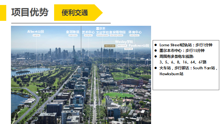 St Kilda Road是墨尔本知名的林荫大道,景色非常优美,是墨尔本内城沿海湾向东南延伸的主干道,火车、有轨电车和巴士四通八达。经过百多年的发展建设,StKilda Road沿线已经成为文化、休闲、购物、餐饮的黄金地带,其已经成为传统的富人区。