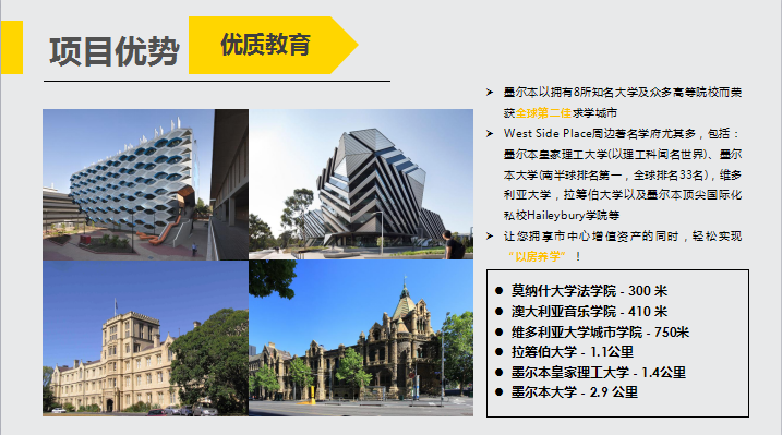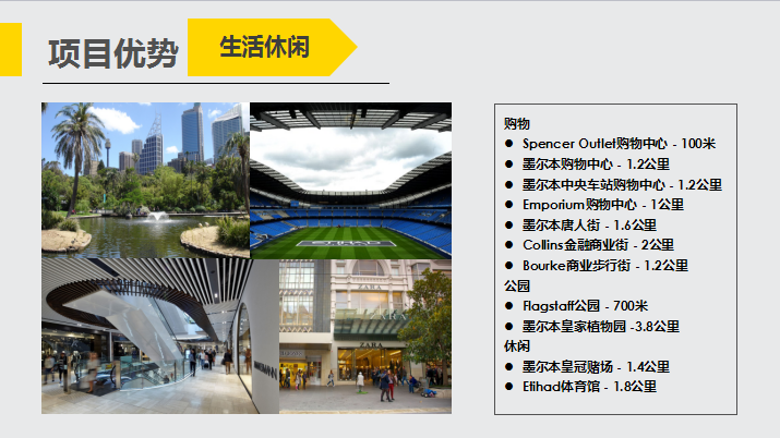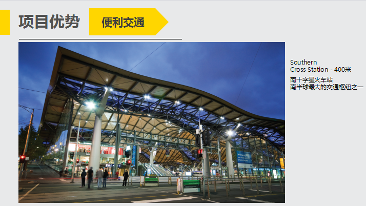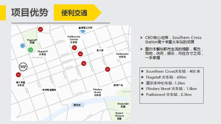 项目位于维多利亚区CBD中心位置,毗邻市中心公园、墨尔本规模最大的伊蒂哈德体育场、南十字星车站、皇家赌场等,是大型企业、高级白领、留学生、游客的集中流向地,也是墨尔本最有“钱途”的繁华核心,独家房源只此一处。