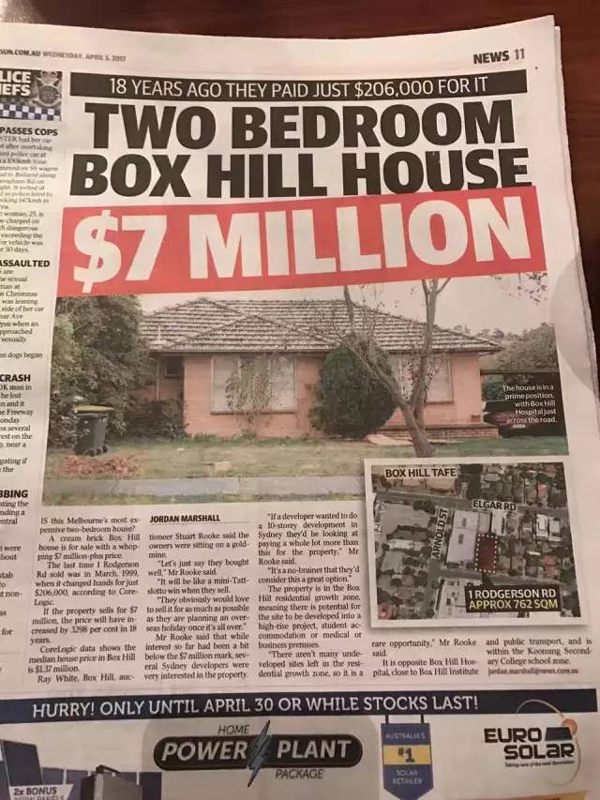 房价日益飙升的Box Hill也成为了投资者们的首选区域。在之前,Herald Sun登出一则新闻:墨尔本东南华人区Box Hill的一套两房别墅以七百万澳元的惊人价格挂牌出售,折合人民币约三千六百万元。也就是说,截止到目前,Box Hill的房价已经暴涨35倍。