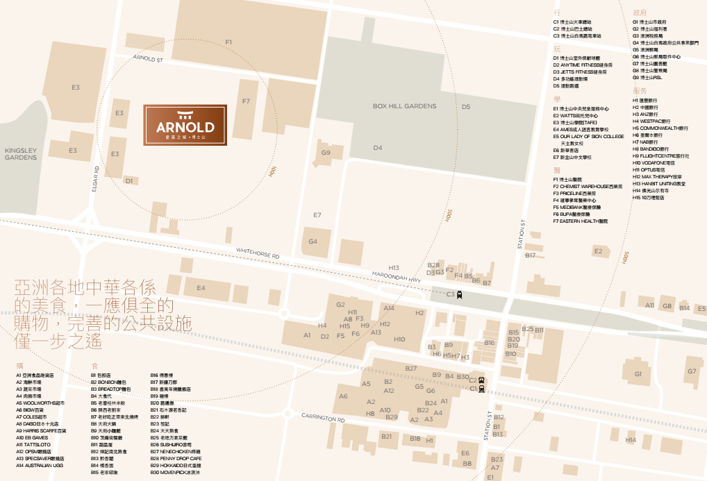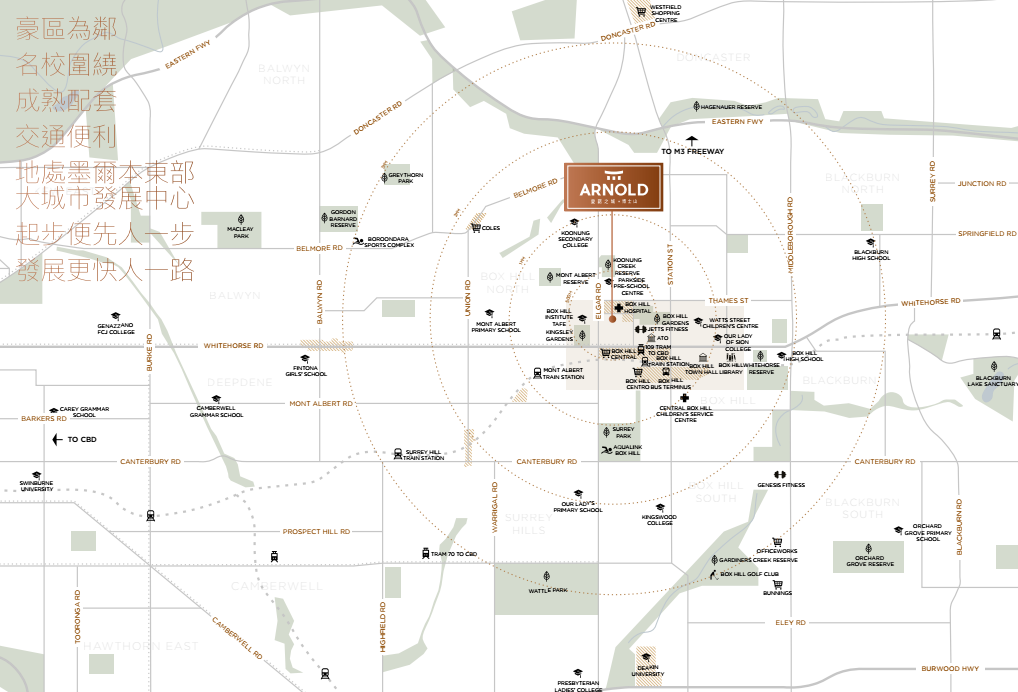 Arnold 位于Box Hill Arnold street上交通便利,地处墨尔本东部大城市发展中心。门口公交车站,步行200米至Box Hill Garden,步行8分钟到ATO大楼,连接109电车站。步行10分钟左右到Box Hill中心,连接火车线。亚洲各地中华各系的美食,一应俱全的购物,完善的公共设施仅一步之遥。不管是投资还是自住,Arnold 爱诺之城都是Box Hill最优选择。