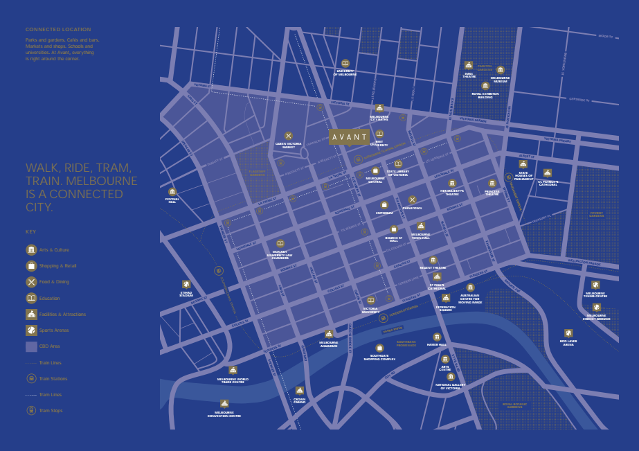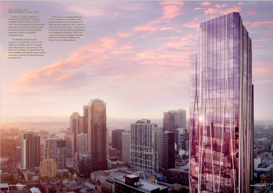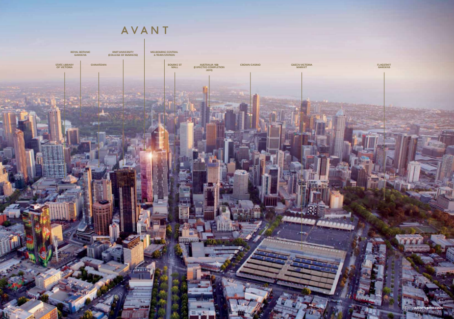 AVANT 以一种独特的方式展现了墨尔本的未来。这座塔楼的建筑美述说着新的文化意蕴。极具诱惑力的雕刻般外形带来感观层面与灵魂层面的双重冲击。这座建筑不仅是豪华住宅公寓,更有奢华住户专属设施。公寓可满足您的不同需求, 适合家庭居住, 喜爱都市生活, 在墨尔本市中心工作的人士或投资人士.公寓设计舒适典雅, 配有冷暖循环空调, 落地窗和阳台.Avant,坐拥墨尔本CBD中心黄金地段“黄金眼”,以极简主义的几何元素作为设计的理念,用大量的线条构建建筑体的轮廓起伏具有极其强烈的视觉表现力,结合其建筑内部高明亮色调的装饰设计,加之55层超高层,成为墨尔本城市又一新地标。
