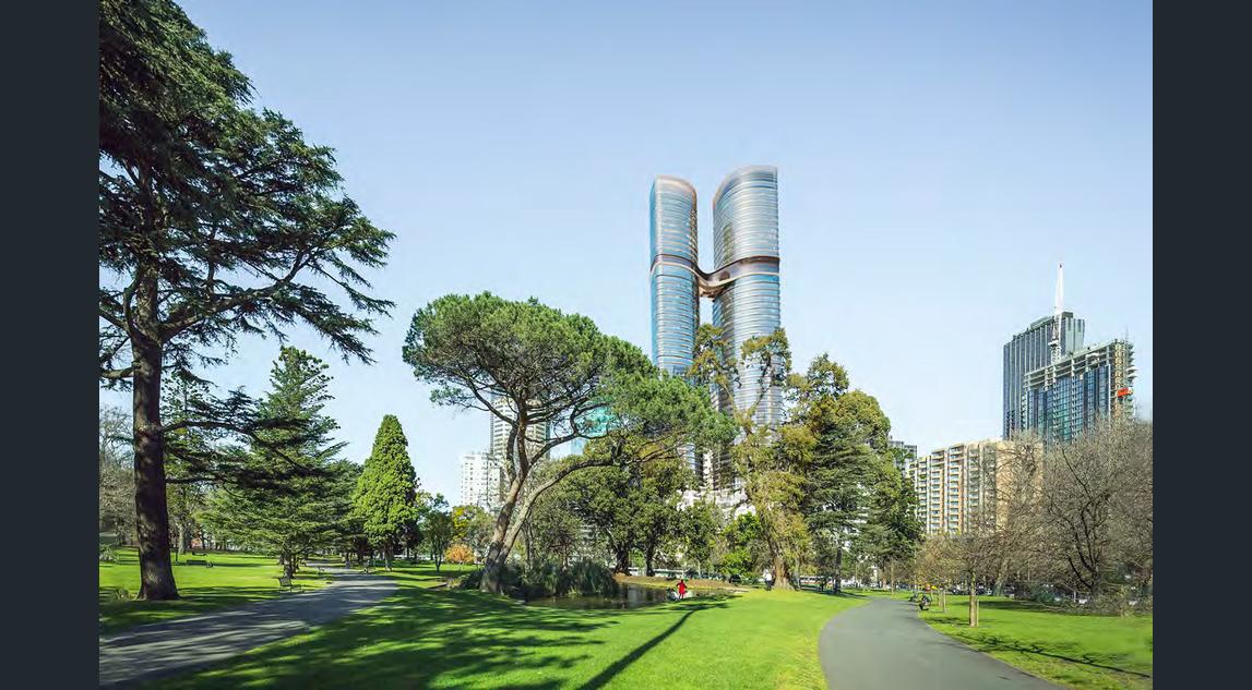 是一座豪华住宅大厦,旁边是五星级香格里拉国际大酒店。一座天桥连接两座塔楼,在墨尔本城市天际线上创造了一座标志性的雕塑。