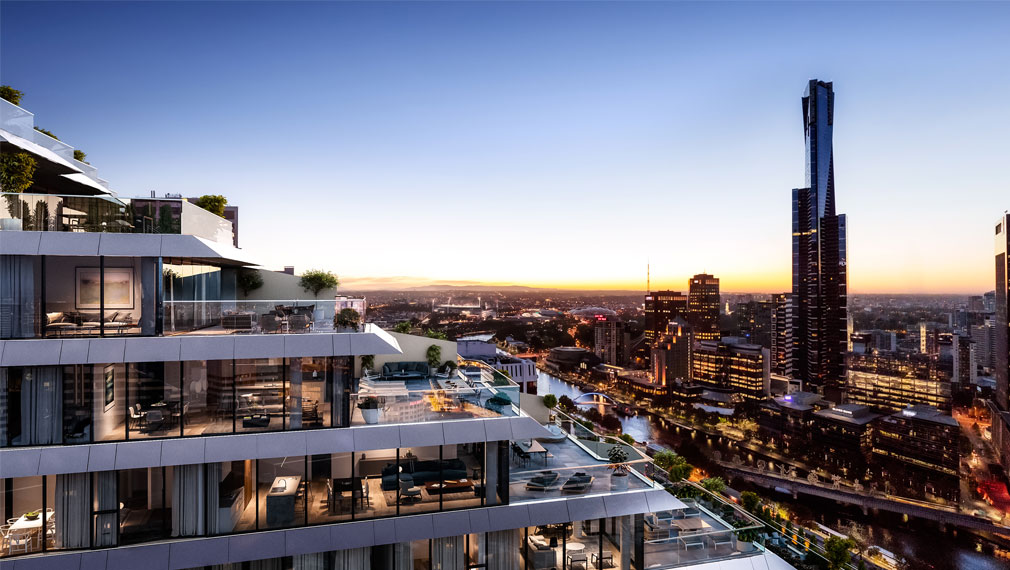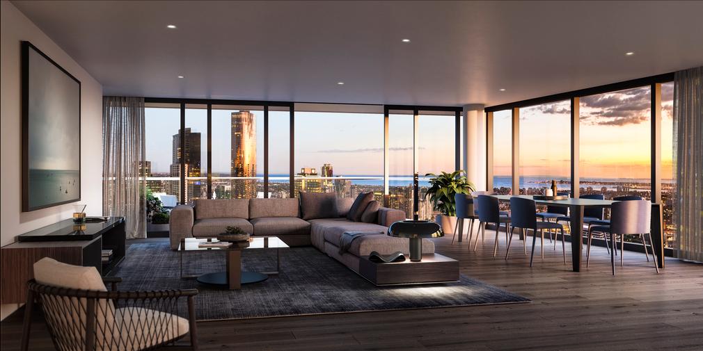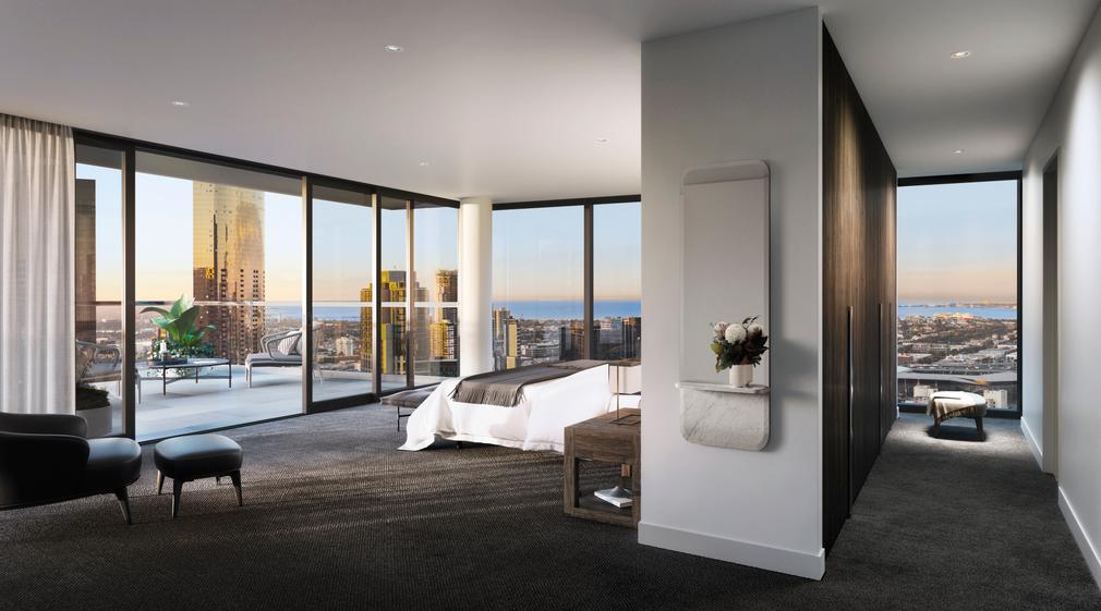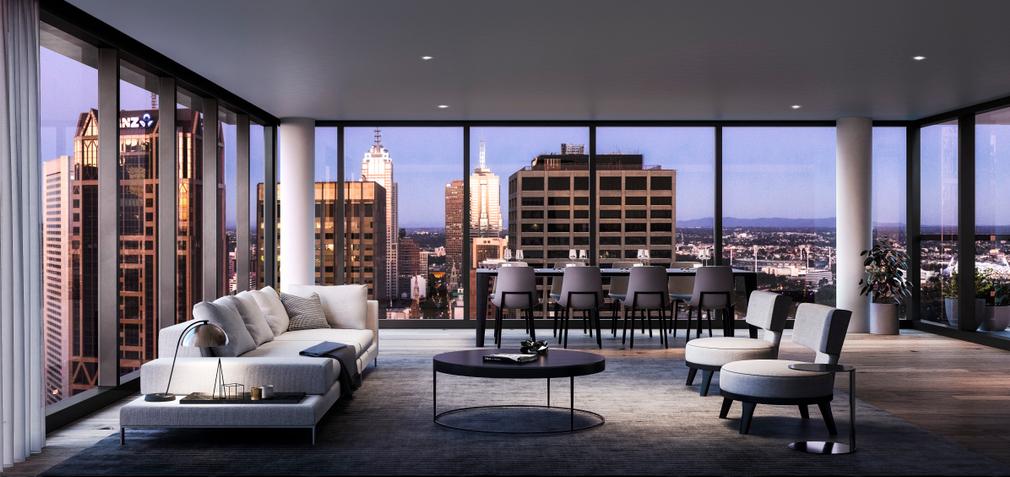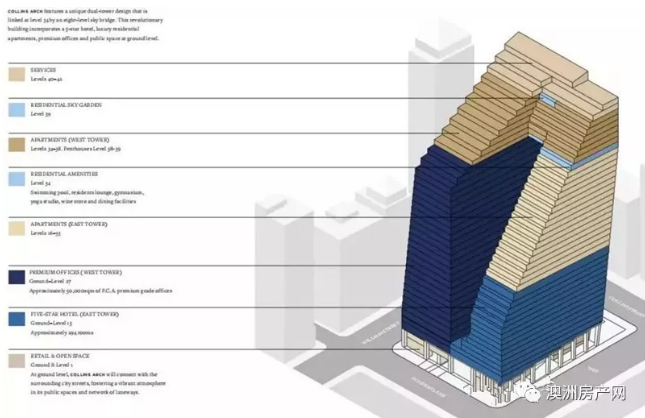 Collins Arch采用双塔设计,形成“拱门”造型。 202套豪华1室、2室和3室公寓和顶层公寓,坐落在2栋大楼上,由墨尔本独特的Sky Bridge连接。