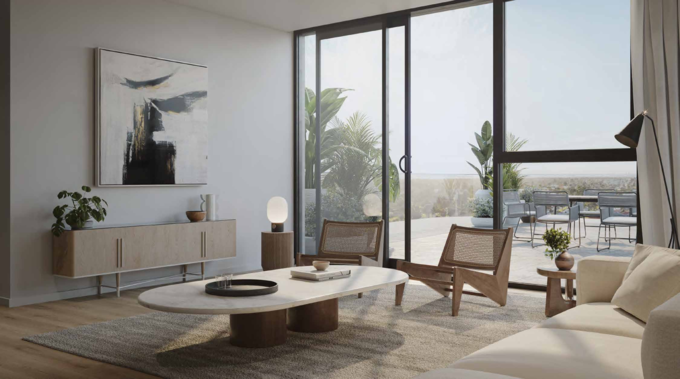 建筑的带状设计和开放性为充满阳光的住宅空间提供了海滨、城市和郊区的景观。