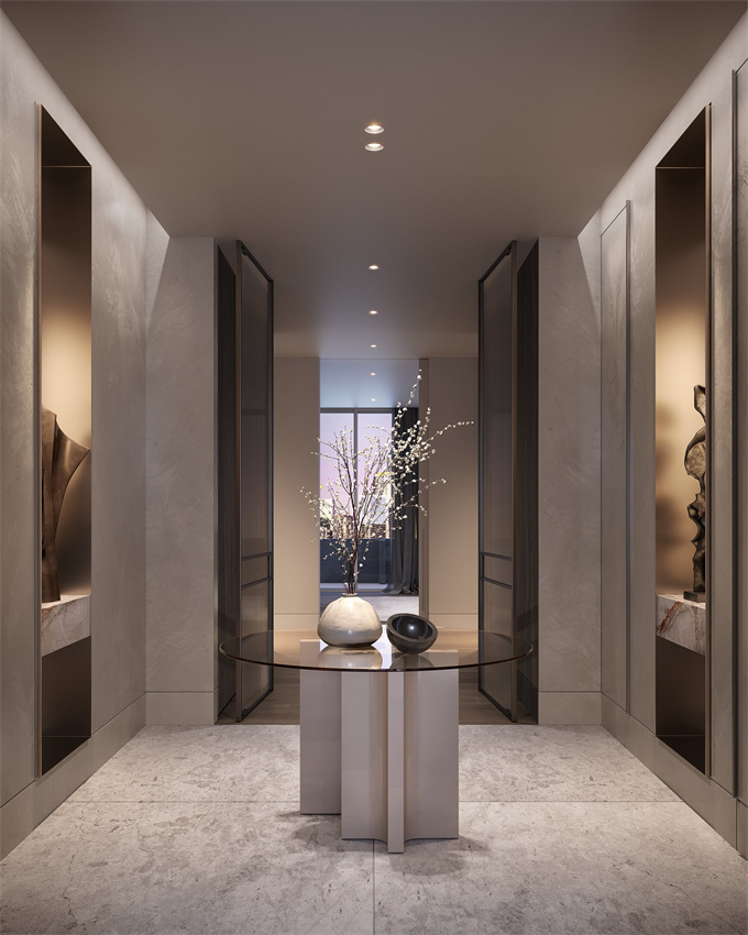 进入顶层公寓后,门厅便映入眼帘。门厅装饰有引人注目的材质,优雅地延伸至整个空间,营造出温馨宜人的氛围。为门槛外的一切奠定了基调。