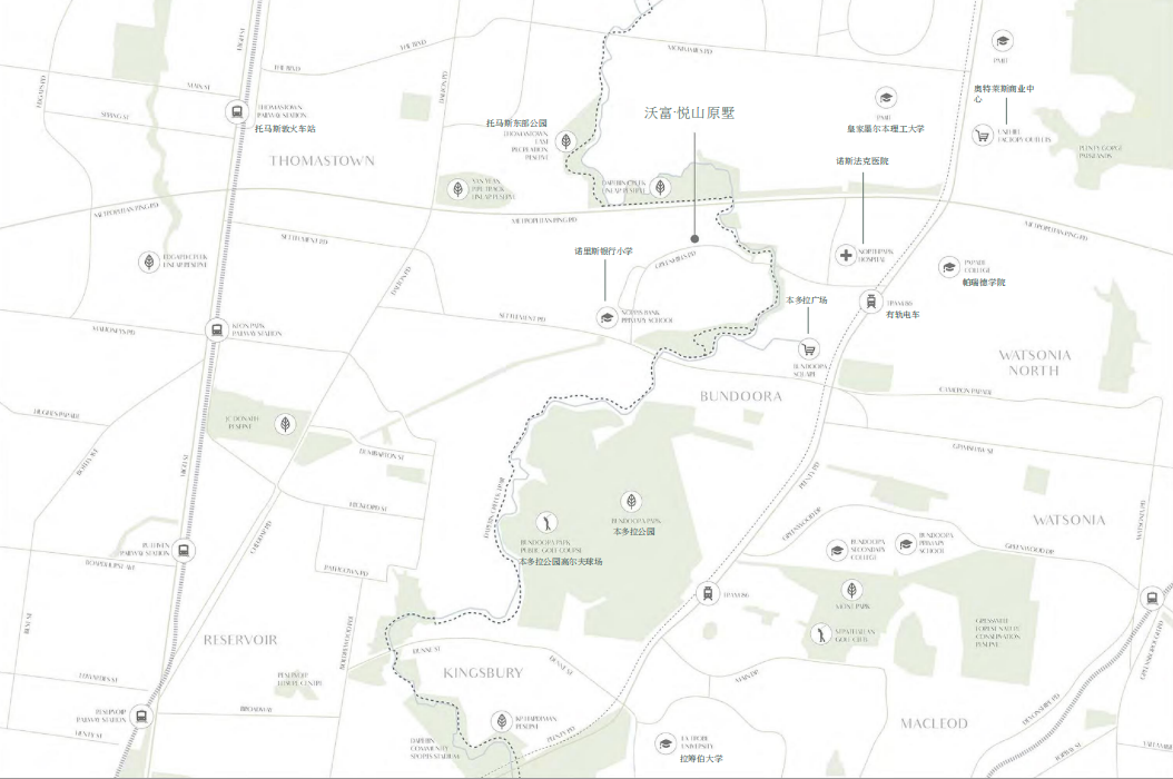 有天有地,有蓝天有小溪,有草地有山脉,有鸟 鸣有鱼儿嬉戏…… 30 分钟即可抵达墨尔本中 心,沃富•悦山原墅择址于此,坐拥Bu n d o o r a 和Th o m a st own的绿色原野,只为让你在这 辽 阔的自然美景中,找到只属于自己的美梦。