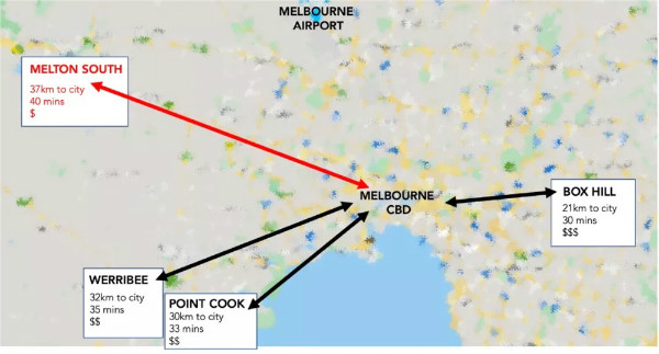 虽然从Werribee、Point Cook、Box Hill三个区域到墨尔本CBD的车程时间仅比Melton South少了7-10分钟,但这三个区域的房屋价格却已远高于Melton South。