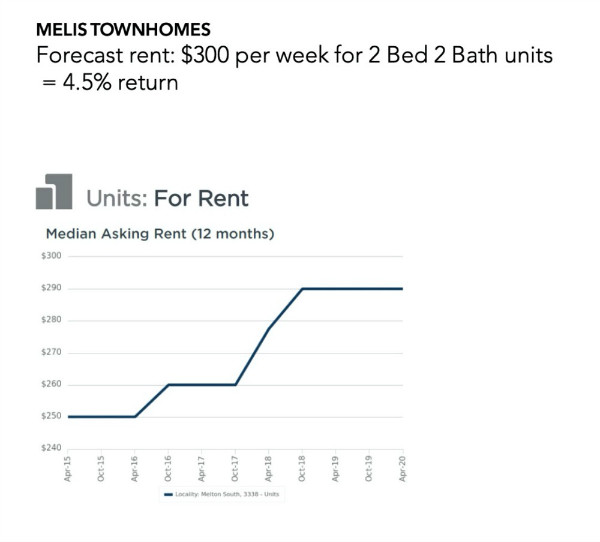 Melton South的居住需求的急剧增加,刺激当地租金也有较大涨幅,Melis花园别墅的全新楼盘,2房2卫户型预计周租金为300-330澳元,租金回报收益达4.5%(近3倍于京沪深收益)。