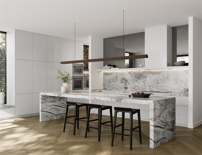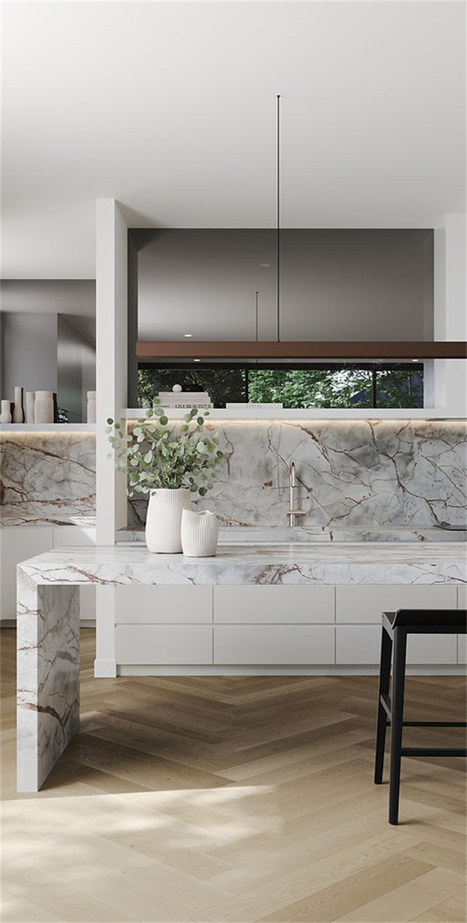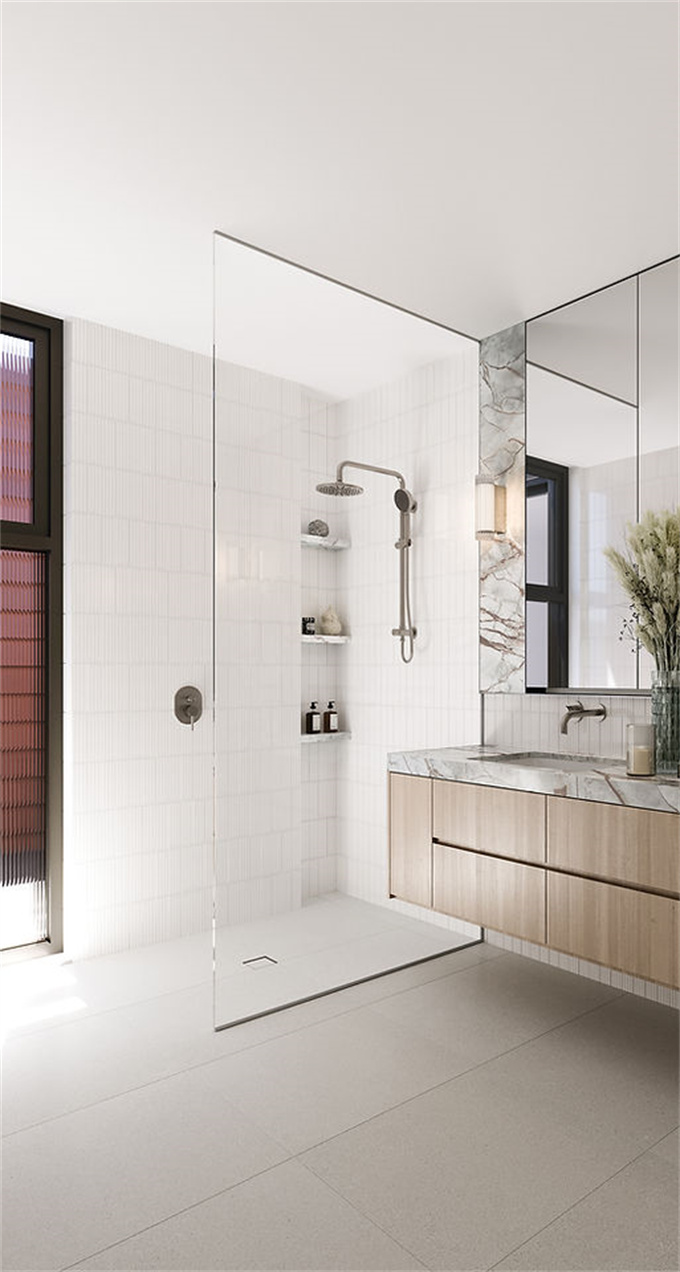 浴室各处均采用 CDK“梦幻灰大理石”,呈现出暗淡的底色,并饰有醒目的铜色和赤土色纹理。这种动态大理石组合与横跨周围墙壁的凹槽光泽瓷砖相得益彰。拉丝镍制固定装置增强了这种设计融合,营造出和谐的现代优雅配色方案。