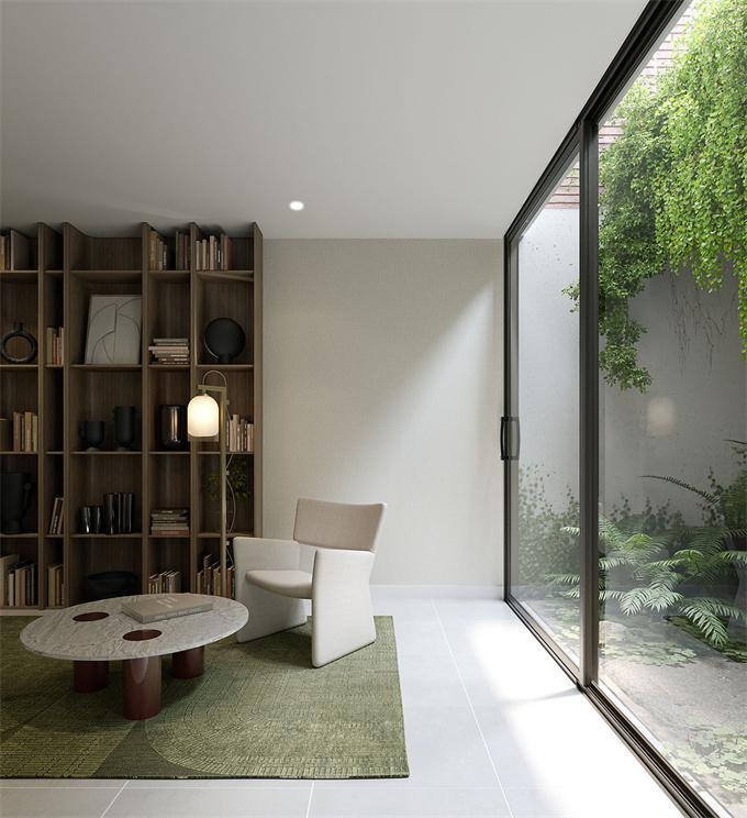 在住宅的入口处,宽敞的书房提供了一个私人工作空间,从这里可以看到向上延伸的连接采光井,创造了一个自然照明的环境。