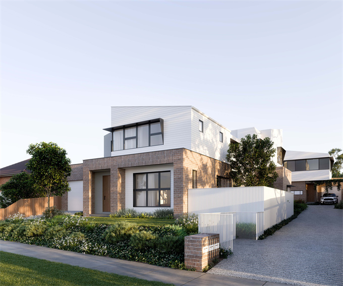 Purinuan Rd 82 号的联排别墅旨在适应各种生活方式。每栋住宅均设有四间宽敞的卧室、两间设计精美的浴室、一个私人庭院和两个专用停车位。凭借其独特的不对称屋顶,该开发项目为当地景观增添了引人注目的建筑风格。大尺寸的水平窗户让充足的自然光透过,而自然色调的砖墙则反映了 Reservoir 地区的特色和魅力。