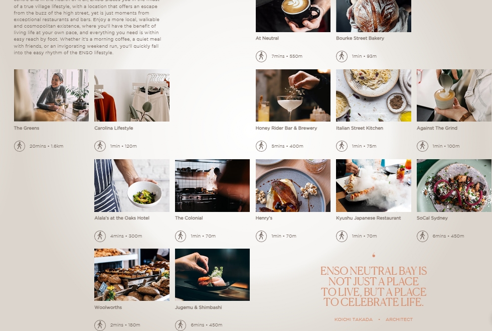 ENSO 位于 Neutral Bay 市中心备受推崇的 Grosvenor 街,地处一切的中心地带,让您置身于真正的乡村生活之中,地理位置优越,远离繁华的商业街喧嚣,距离一流的餐厅和酒吧仅几步之遥。享受更具本地特色、步行性和国际化的生活,您可以按照自己的节奏生活,所需的一切都在步行范围内。无论是早晨喝杯咖啡、与朋友安静地共进晚餐,还是周末跑步,您都会很快融入 ENSO 生活方式的轻松节奏。
