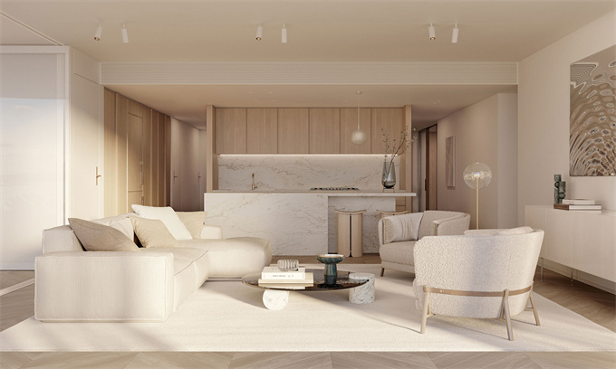 Richards Stanisich 的室内建筑师为 AURA 住宅策划了三种现代色调——浅色、中色或深色。 灯光方案采用鼓舞人心的新鲜色调,以法国橡木地板和盐萨克森地毯的纹理材料为基础。 中间方案是奢华与温暖的结合,采用白蜡木法国橡木地板和达尘萨克森地毯。深色方案是纹理丰富的烟熏欧洲橡木地板和萨克森大象地毯的丰富调色板,奢华与现代相遇。