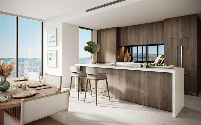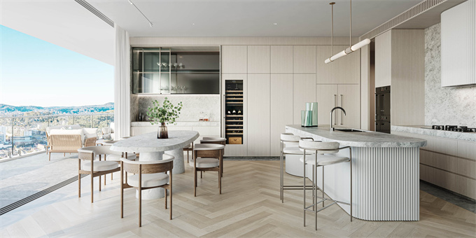 顶层厨房设计悠闲优雅,让人联想到海滨生活,配有宽敞、雅致和豪华的装饰,包括高端优质 Fisher & Paykel 电器。这些光线充足的厨房可轻松通往宽敞的起居空间,为亲密的家庭聚会或璀璨的鸡尾酒会提供时尚的背景。