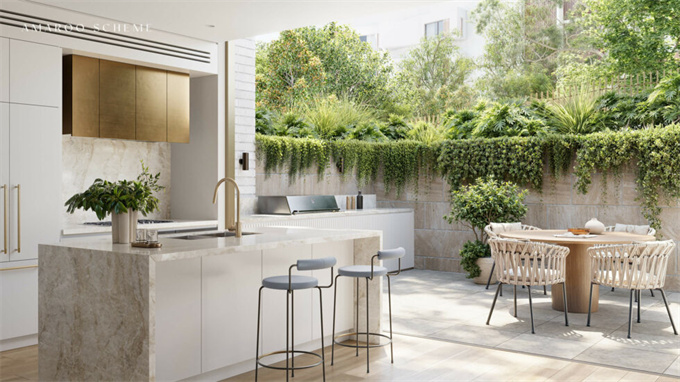 设计中不可或缺的一点是从室内到室外空间的流畅、轻松的过渡。每套住宅都享有定制的户外厨房,配有内置烧烤架和宽敞的台面空间,方便娱乐。