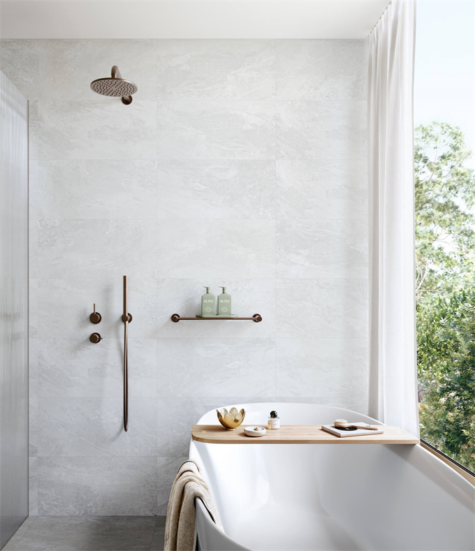 浴室宁静而优雅。雕刻的瓷质盆置于现代风格的橡木盥洗台上,凹槽玻璃淋浴间增添了纹理组合,混凝土地板和墙砖具有大胆的视觉效果。主浴室配有独立式 Parisi 浴缸和双盥洗台,而 Astra Walker 水龙头则为这些精致的空间增添了点睛之笔。