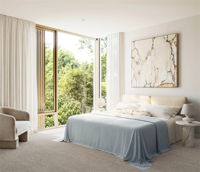 卧室拥有令人心旷神怡、轻松愉悦的氛围,散发出一种避难所般的感觉。内置衣柜宽敞,羊毛地毯踩上去柔软舒适,落地窗可俯瞰周围的绿地。主卧配有步入式衣柜和设计师套间,十分豪华。