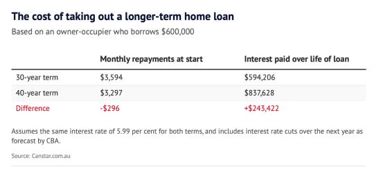 如果有人想贷款60万澳元,并选择40年期房贷而不是30年期,且利率相同(5.99%),他们每个月的还款额可以少296澳元。