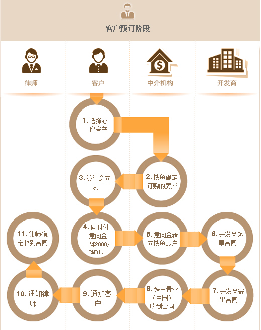 选定自己喜欢的房型和房号,签订预购协议,并支付定金1000-5000澳币不等,上开发商申请保留房产。开发商收到定金后,在2-3天内向购买者的律师提供购房合同。