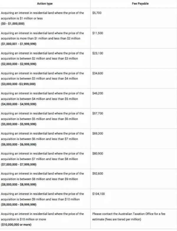 FIRB申请费:对于100万澳元以下的房产,申请费用为5500澳元,以此类推,如果所购买物业超过1000万澳元,则需上报澳大利亚税务局ATO。