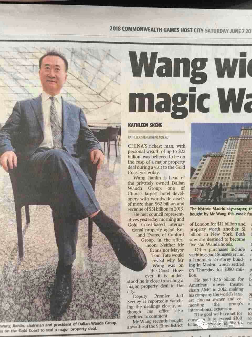 据2014年6月7日黄金海岸当地媒体Gold Coast Bulletin报道, 身家超过220亿美元的中国首富,大连万达集团董事长王健林6日造访了黄金海岸,并与市长Tom Tate进行了亲切交流。Tate市长并为向媒体详细透露与王健林董事长沟通的细节,但据信与万达集团即将完成的一项在黄金海岸的重要房地产收购项目相关。此举意味着中国的机构投资者看好黄金海岸的商业投资前景,即将大举进军黄金海岸这一澳洲传统的“富人后花园”和中国富裕阶层的澳洲首选移居目的地。