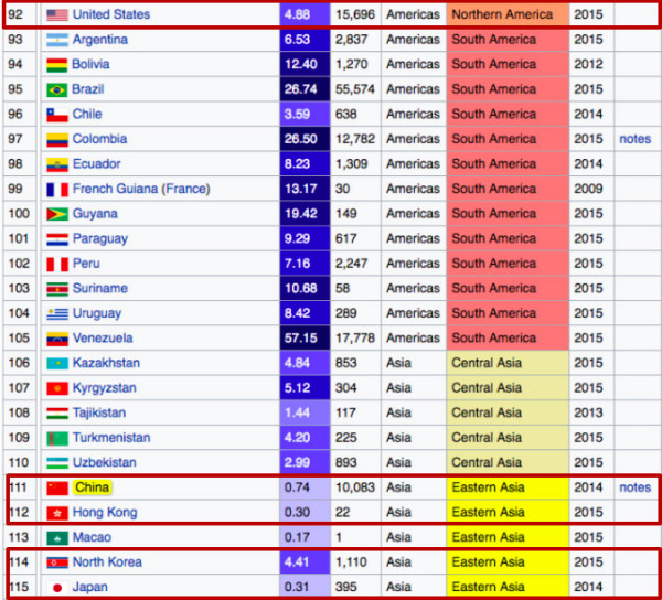 据Wikipedia网站报道,数据是根据被统计地区每年每10万居民中的杀人犯罪数量统计得出的。