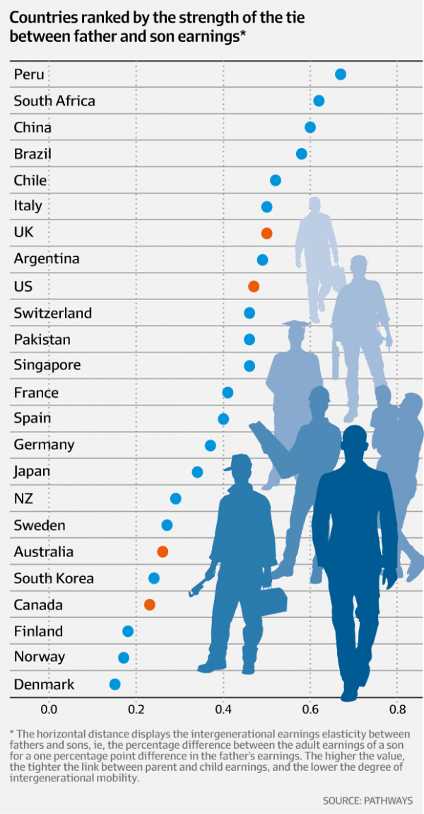 从上图我们可以看出,秘鲁、南非和中国的代际薪资关联程度都相当高。拿中国来说,父亲的收入对孩子的收入有着高达60%的影响!而反观丹麦、挪威、芬兰以及澳大利亚,代际薪资影响程度均相当小。在澳大利亚,父亲的薪资只对孩子有着20%的影响。