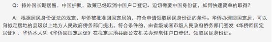对于“持外国长期居留,中国护照,政策已经取消中国户口登记和身份证”的,“根据居民身份证法的规定,华侨被批准回国定居的,符合申请领取居民身份证的条件。