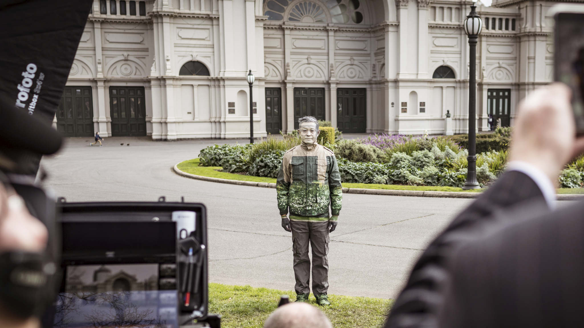 在墨尔本,他静坐6个小时、24小时内仅喝了一杯咖啡以节省时间,只是为了完成了全身的“伪装”,然后站在墨尔本地标性的Royal Exhibition Building前拍下一张照片。他对本次的拍摄非常满意,并感谢资深戏剧、影视风景艺术家Patrick Jones和身体画家Juliet Bradford等助手。