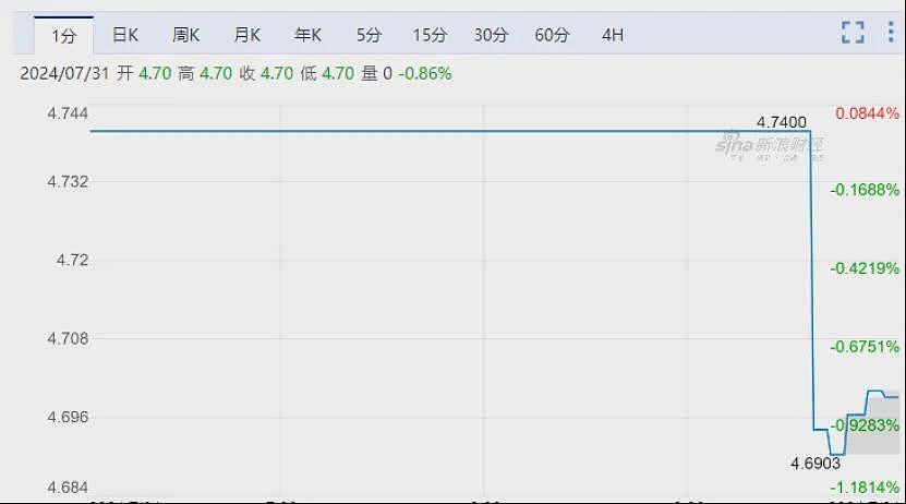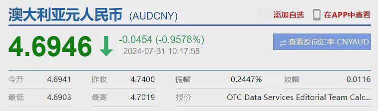 就在通胀数据公布之后,澳元汇率瞬间跳水,澳元兑人民币汇率跌破4.7的大关,维持在4.6946的水平。