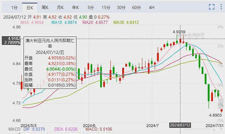 自7月中旬达到4.93的高点后,澳元兑人民币汇率一直在持续下跌,最近几天才暂时形成低点,趋于稳定。