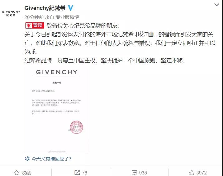 2019年8月12日下午4:10,全网等待的Givenchy纪梵希道歉声明终于来了,同样表态:坚决拥护一个中国原则!但外网没有同步,所以这事儿还没完,继续等待下一波。