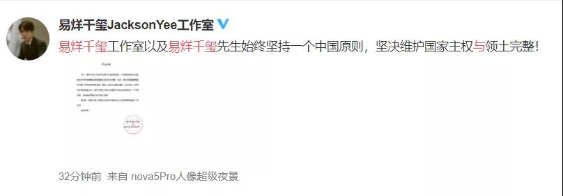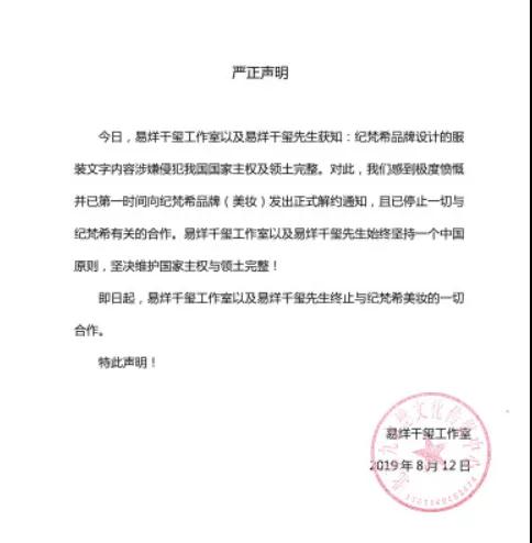 下午2:34,易烊千玺的工作室已经第一时间发表声明,坚持一个中国原则,坚决维护国家和主权完整,终止和纪梵希的合作。